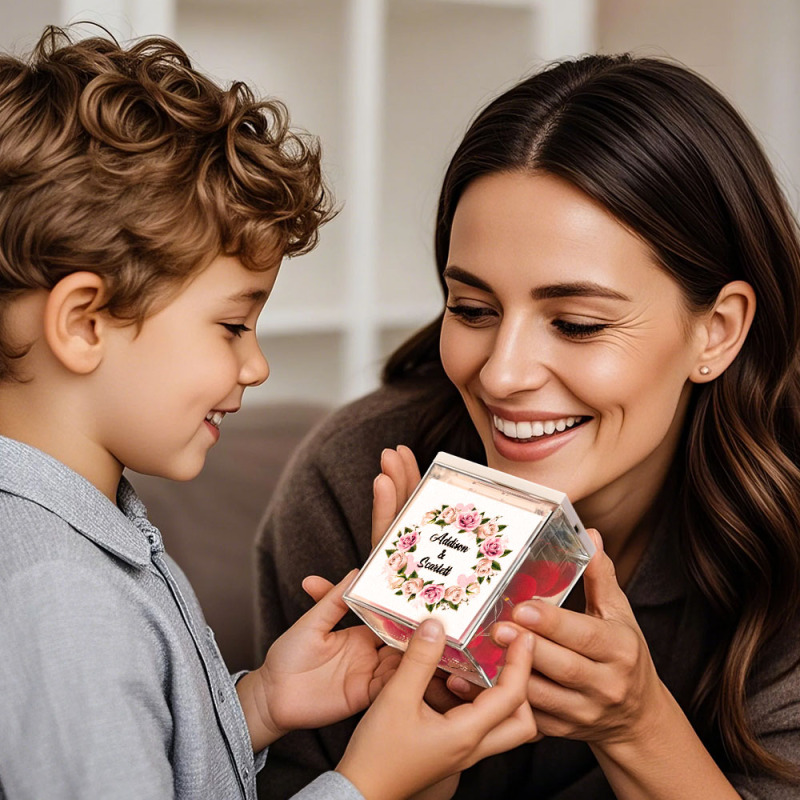 Mini Tocadiscos De Vinilo Personalizado En Caja De Acrílico. Regalo Personalizado Con Nombre Y Flores Para Mamá En El Día De La Madre.