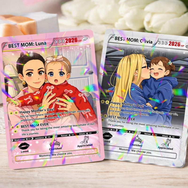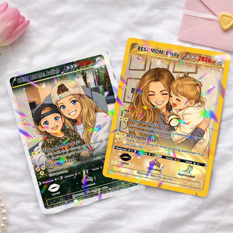Celebra a mamá con un recuerdo verdaderamente especial convirtiendo su foto en una adorable tarjeta de juego. Diseñada para ser divertida, personal y llena de sentimiento, esta tarjeta personalizada captura su encanto único en un divertido estilo anime. Esta tarjeta única seguramente se convertirá en un recuerdo preciado que le encantará mostrar.