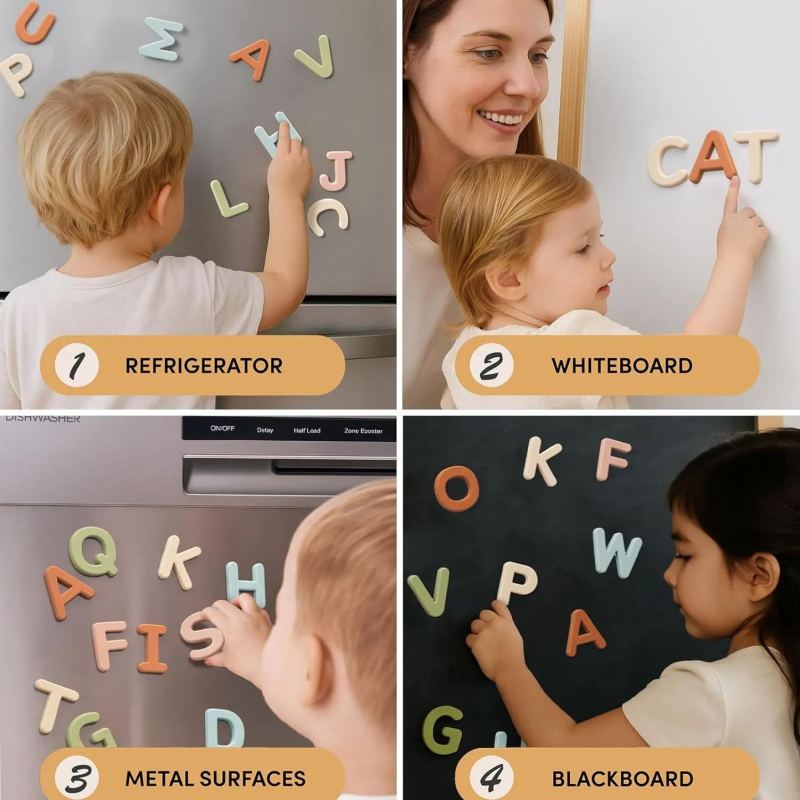Cada letra cuenta con imanes integrados que permiten que se adhiera firmemente a refrigeradores, pizarras blancas y otras superficies metálicas. Sin resbalones ni caídas: solo un juego estable y entretenido.