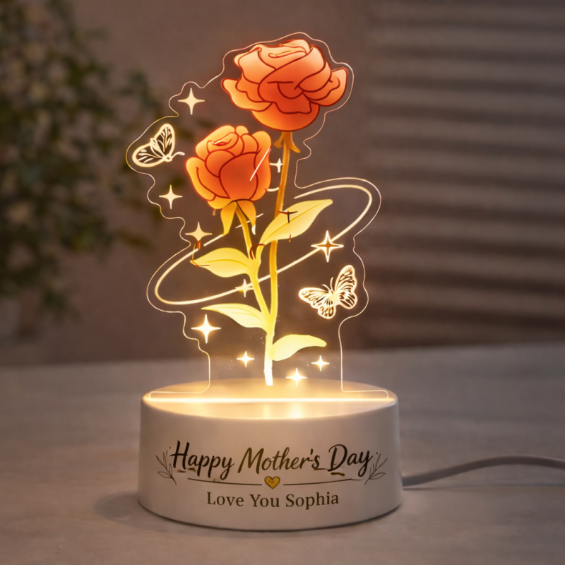 Celebra a mamá con un regalo que perdurará para siempre. Esta lámpara de noche LED personalizada con forma de flor eterna combina la belleza atemporal de rosas, tulipanes y lirios del valle con un suave brillo cálido, creando un recuerdo entrañable que podrá atesorar eternamente. Cada flor se puede grabar con nombres, palabras cortas o mensajes significativos, convirtiéndola en un regalo único para el Día de la Madre, lleno de amor y recuerdos. El elegante diseño floral de acrílico luce espléndido en una mesita de noche, escritorio o estante de la sala, aportando calidez a cada rincón de su hogar.